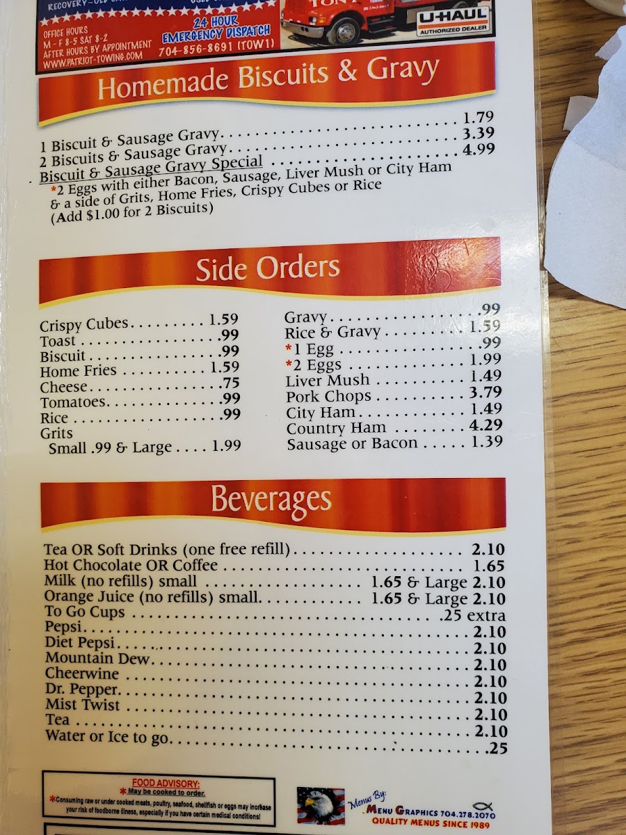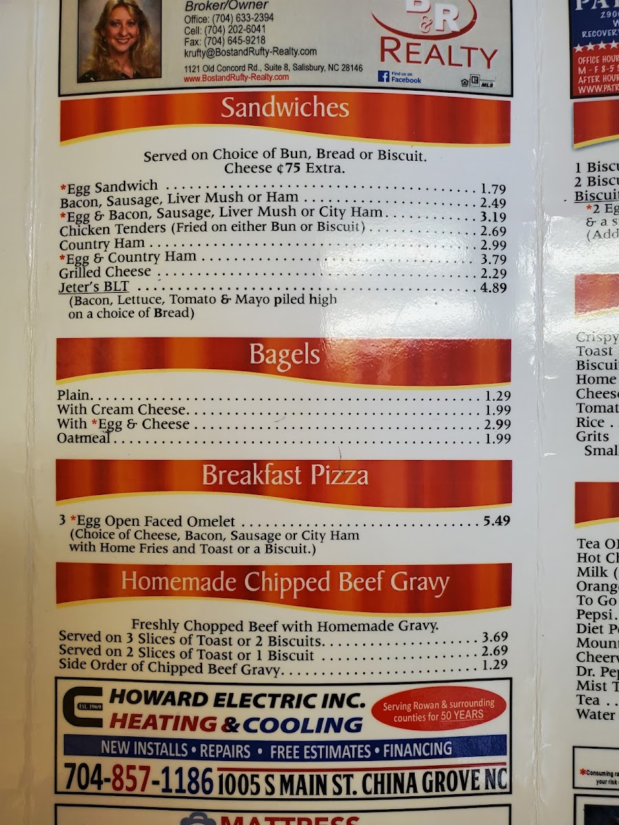 The menu features classic sandwiches like the Club Sandwich and Jeter’s BLT, alongside hearty options such as the Carolina Classic Burger and a warm Beef Vegetable Soup. Morning visitors often enjoy breakfast staples like Eggs and Livermush or the Breakfast Pizza, pairing simple flavors with a laid-back setting. For those who prefer lighter or cooler choices, there are fresh salads including the Chef’s Salad and Turkey Pasta Salad, which complement the homestyle sides and a selection of comforting beverages.