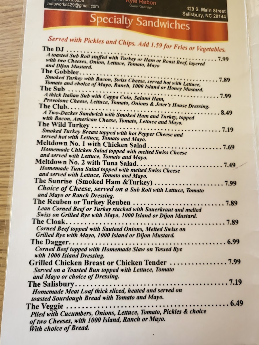 Jeter's Deli Cafe Menu